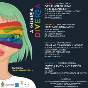 El sábado 10 de julio a las 12 horas, la Praza do Reló será el escenario de la mesa redonda «Familias TransOrgullosas», impartida por Soledad Fernández, Pilar Fonte y Alejandra Alvedro y moderada por Sara Uris. Se abordarán temáticas como las expectativas de la crianza, la diversidad familiar y la transexualidad en la infancia. También se retransmitirá en directo en la cuenta de YouTube del Concello, y contará con una actuación del grupo de baile Xamaraina.