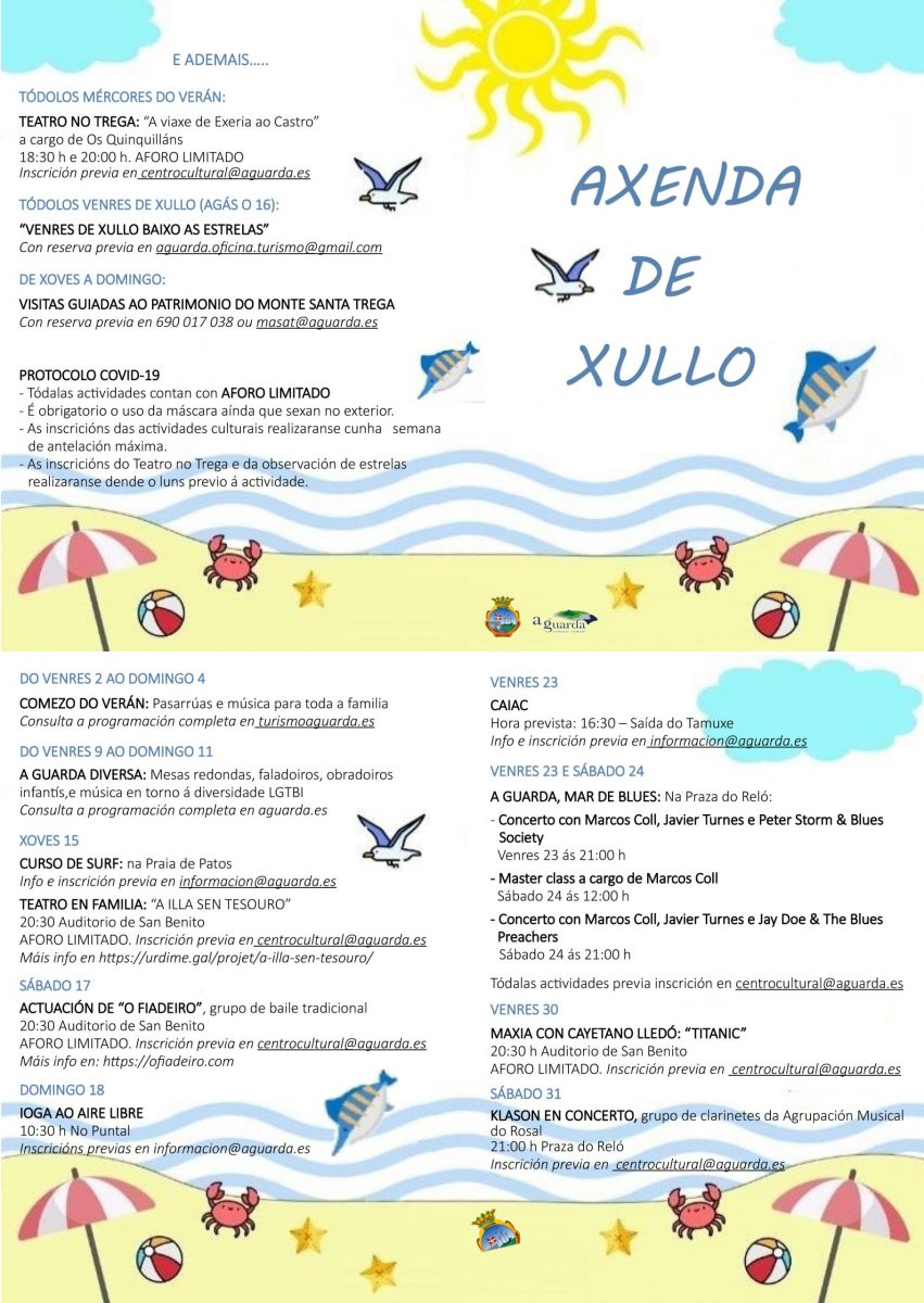 El Concello de A Guarda acaba de publicar la agenda de julio, que este año trae actividades para todas las edades en una programación que incluye conciertos, actividades deportivas, espectáculos infantiles y visitas guiadas, entre otras.