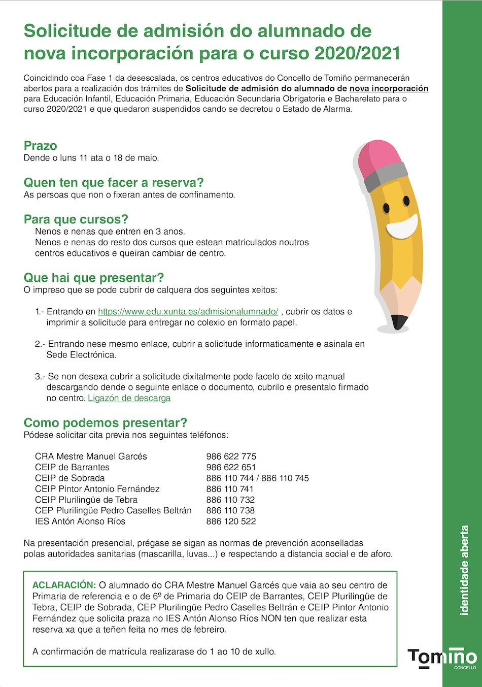 Coincidiendo con la Fase 1 de la desescalada, los centros educativos de Tomiño permanecerán abiertos del 11 al 18 de este mes, para la formalización de los trámites de solicitud de admisión del alumnado de nueva incorporación para Educación Infantil, Educación Primaria, ESO y Bachillerato para el curso 2020-2021; trámites que fueron suspendidos cuando se decretó el Estado de Alarma.