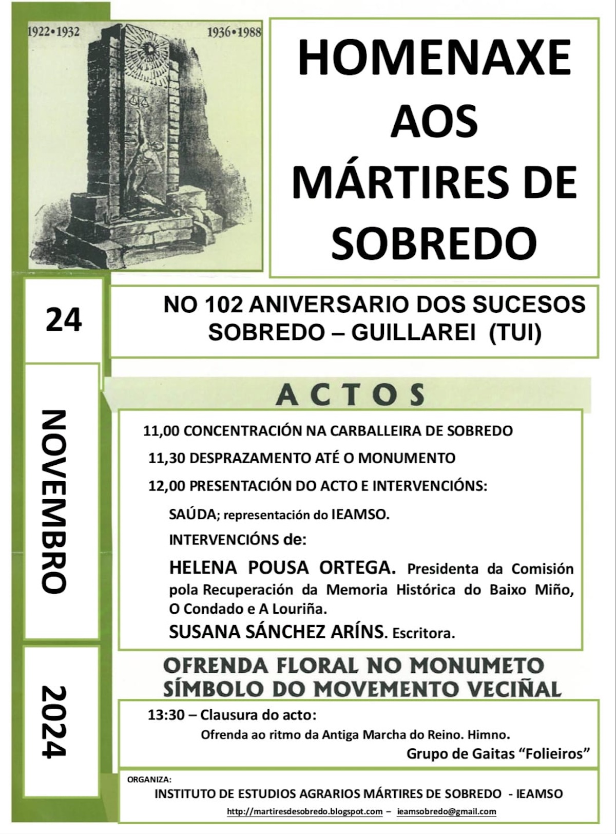 No luns 25 de novembro ás 19:30 horas, na Sala Félix Rodríguez (Edif. Francisco Sánchez)-Tui, esta programada a conferencia e coloquio: “Sobredo. O Legado do Agrarismo Miñoto para a República”; Con Natalia Jorge Pereira; historiadora e autora da Tese Doutoral: Actitudes e comportamentos sociais nos concellos fronteirizos de Tomiño e Cerveira ante as ditaduras de Franco e Salazar.