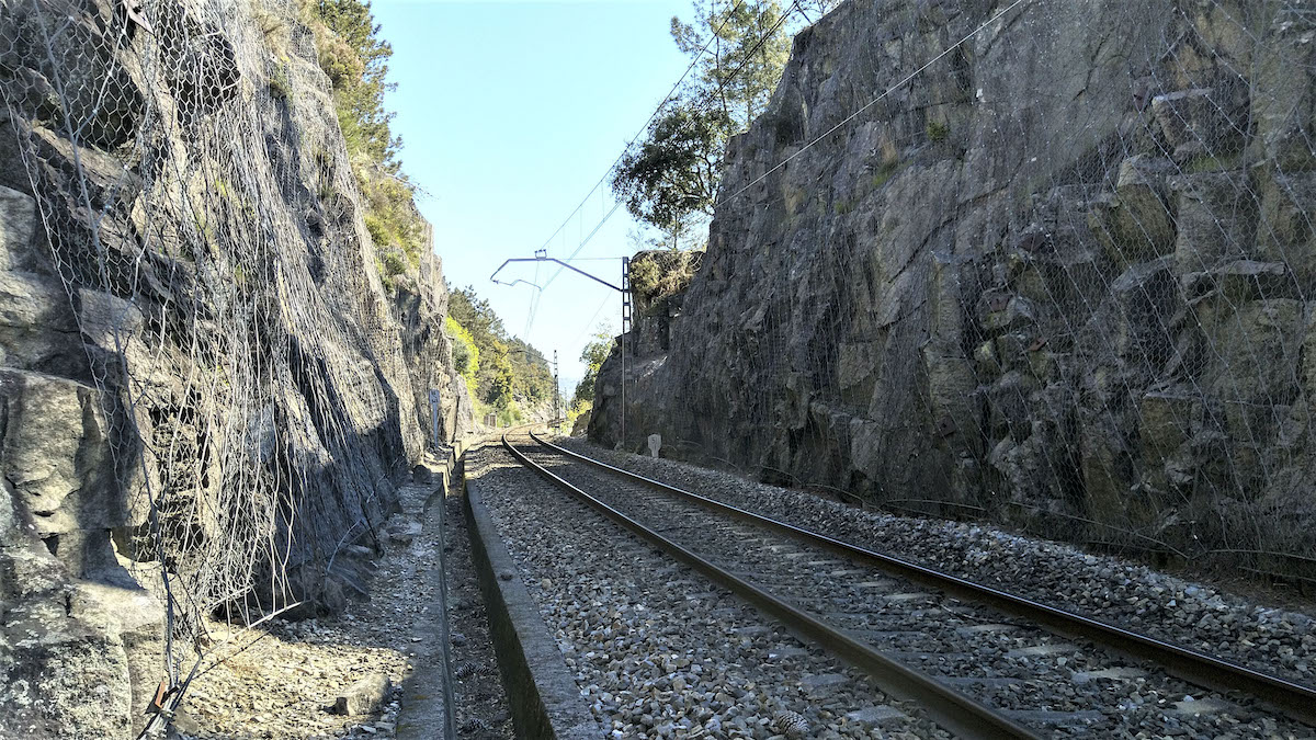 Así, en la línea Guillarei-frontera portuguesa, se reparará la trinchera entre los pp.kk. 4/172 y 4/703 (Tui). Se empleará un sostenimiento mediante claveteado de suelos (técnica conocida como ‘soil nailing’). Se dispondrán bulones pasivos en una malla y se reforzará con una capa de mallazo electrosoldado y armaduras de refuerzo en los bulones.