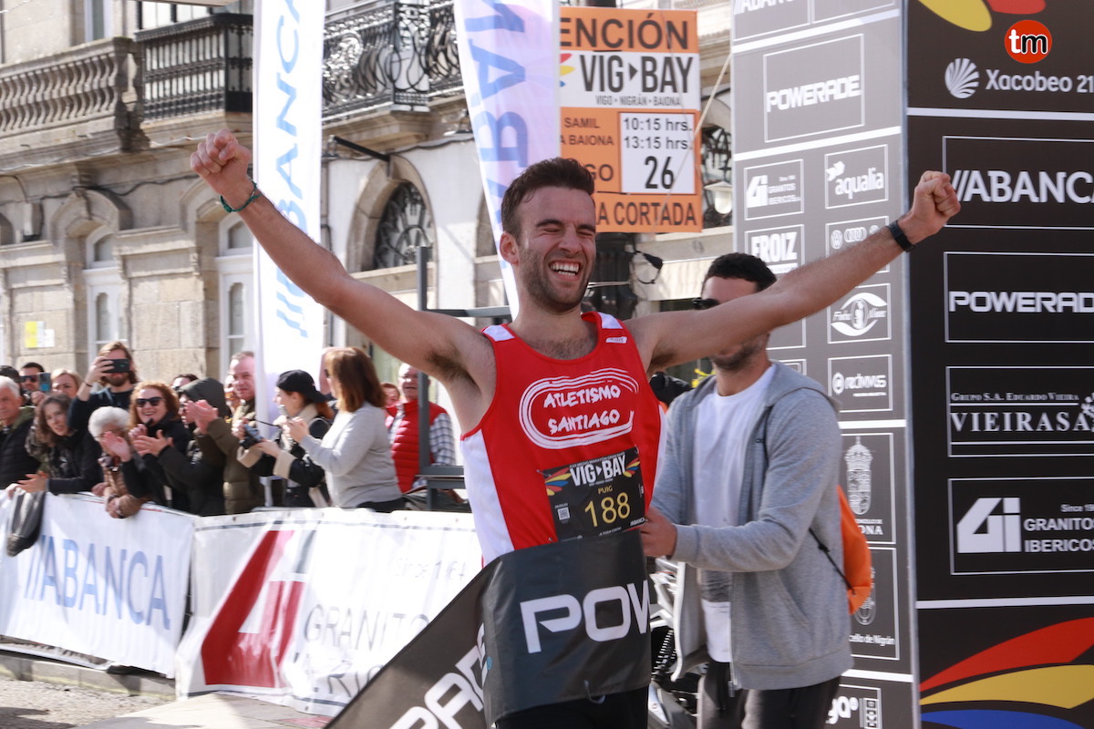 En la prueba masculina se impuso Jorge Puig con un tiempo de 1.07.27. El atleta de 1.500 demostró que también se defiende en las pruebas en ruta. Puig acudió a la Vig-Bay tras ganar el Campeonato Gallego en ruta de 5 kilómetros y lideró la prueba desde el kilómetro cinco para cruzar en solitario la línea de meta. Segundo fue Pablo Otero y tercero fue Alejandro Fernández.