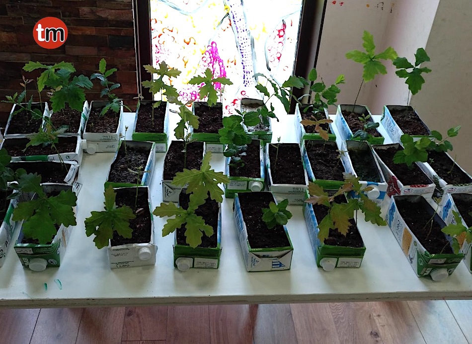 Hemos sembrado en nuestras instalaciones, en unos tetrabriks de leche, unas 60 semillas de carballo y alcornoque, para que después los alumnos planten las plantas que brotaron en el merendero de O Monte Galiñeiro de Vincios”, explica el profesor del centro, Joaquín Pintos, que da clases de arte, escultura y música.