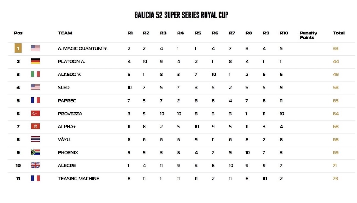 La Galicia 52 Super Series Royal Cup acabó con el American Magic Quantum Racing de Doug DeVos conquistando su quinta Royal Cup, tras las tres consecutivas logradas en 2013, 2014, 2015 y la penúltima obtenida en 2022. Sumó 33 puntos, una amplia distancia de su rival más directo, el alemán Platoon Aviation, que acabó segundo con 44 puntos. La medalla de bronce fue para el italiano Alkedo Vitamina de Andrea Lacorte, con 49 puntos.