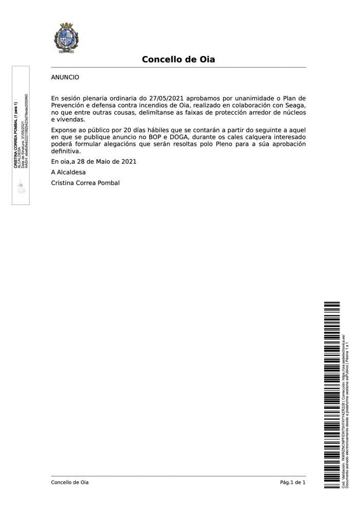 Anuncio del Concello de Oia sobre el Plan de Prevención de Incendios