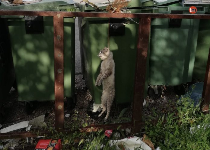 Algún desalmado y sin escrúpulos ha colgado un gato de un contenedor de la basura cerca del colegio de Fontes, en Baíña, Baiona.