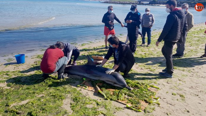 “Trátase dun golfiño riscado de 2,20 metros e ten entre 15 a 20 anos. Decidimos rehidratalo e tentamos introducilo no mar. Ao principio tardou en reaccionar e saíu en dirección á boca da ría, pero ao final volveu varar. Tivemos que sacrificalo para que non sufrise. No que vai de ano xa en vararon nas costas galegas 150 animais,”, explicó Alfredo López, de la Cemma.