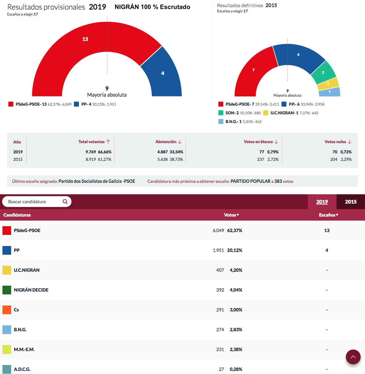 Tan sólo dos partidos estarán representados en el concello de Nigrán los próximos cuatro años. El PP, que logra cuatro concejales y el PSdeG-PSOE que, con su candidato Juan González, obtiene una aplastante mayoría absoluta al conseguir 13 escaños, seis más que en las anteriores elecciones municipales.