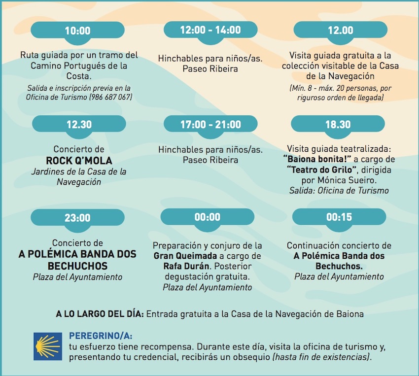 • Ya por la tarde, a las 18:30 horas, comenzará la visita guiada teatralizada “Baiona Bonita!” en la que los intérpretes realizarán un viaje en el tiempo y se meterán en la piel de personajes célebres relacionados con la Villa contándonos su historia en primera persona. Será a cargo de “Teatro do Grilo”, dirigida por Mónica Sueiro.
