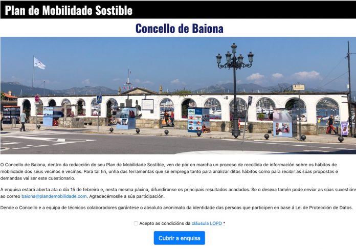 A partir de hoy, 26 de enero, y a través de la web del Concello de Baiona, cualquier persona residente en el municipio tendrá la opción de participar en una consulta digital online orientada a conocer, tanto las demandas y propuestas, como los hábitos de movilidad de su vecindario en relación al Plan de Movilidad Sostenible.