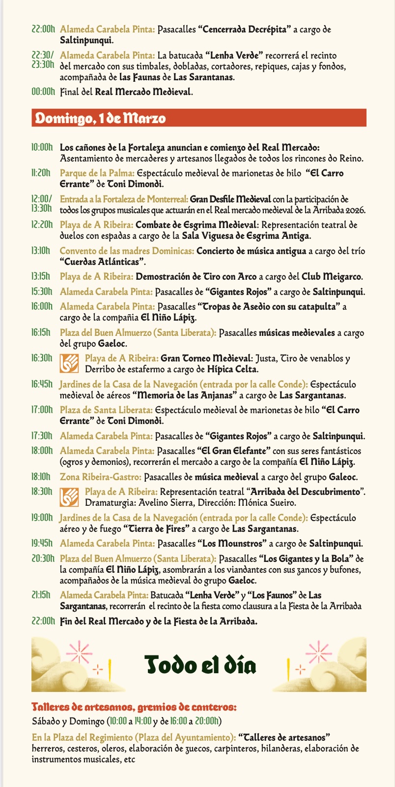 Música en directo, malabares, espectáculos de fuego, demostraciones de oficios tradicionales, esgrima y un gran torneo medieval en la playa de Ribeira forman parte de una programación pensada para todos los públicos. Aunque en esta edición no habrá exhibiciones de cetrería, se mantienen las populares justas medievales, los títeres y talleres infantiles, además de numerosas actividades participativas para los más pequeños.