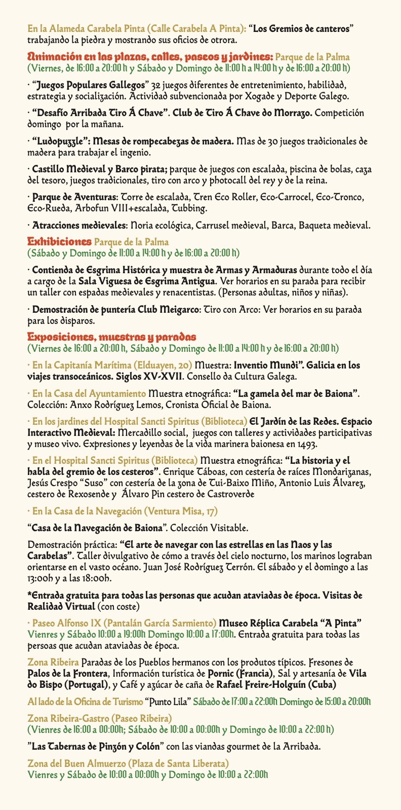 La fiesta, que alcanza ya su XXX edición, recrea el momento en que la embarcación arribó al puerto baionés el 1 de marzo de 1493, convirtiendo a la localidad en el primer lugar de Europa en conocer la noticia del Nuevo Mundo. La representación teatral de este episodio volverá a ser uno de los actos centrales del programa, junto con el gran desfile medieval y el tradicional mercado, que llenará plazas y callejuelas de puestos de artesanía, gastronomía y animación.