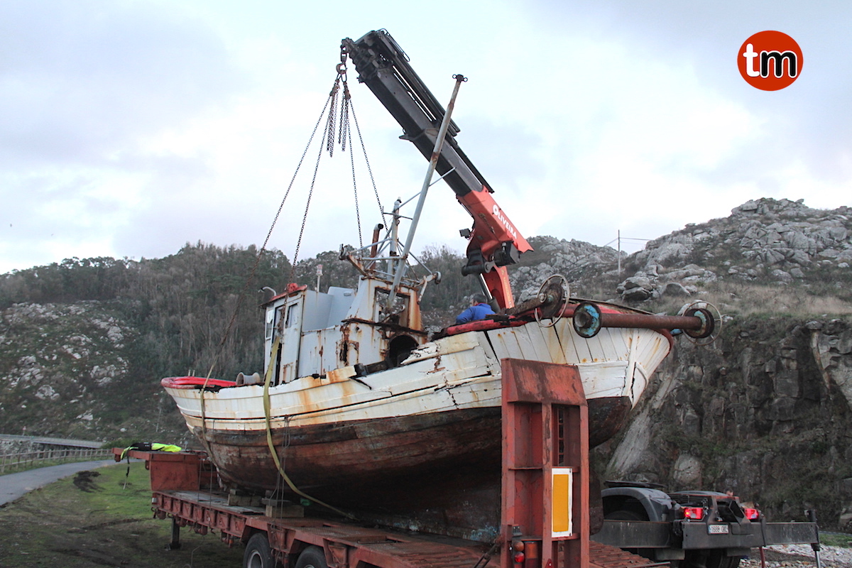 El viejo barco, cuyo nombre desconocemos, procedía de Cambados, y allí se va de nuevo para que un astillero lo desguace tras pasar varios años a la intemperie sin cuidado alguno. Víctima de las cámaras fotográficas, familias, novios, amigos y hasta peregrinos, posaban ante los ojos de los objetivos para tener un recuerdo de un pequeño barco pesquero en tierra firme.