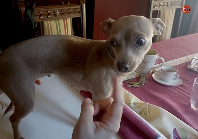 La perrita es de color marrón, tiene microchip, está vacunada, lleva un collar para pulgas de color gris y es una mezcla de chihuahua y pinscher.