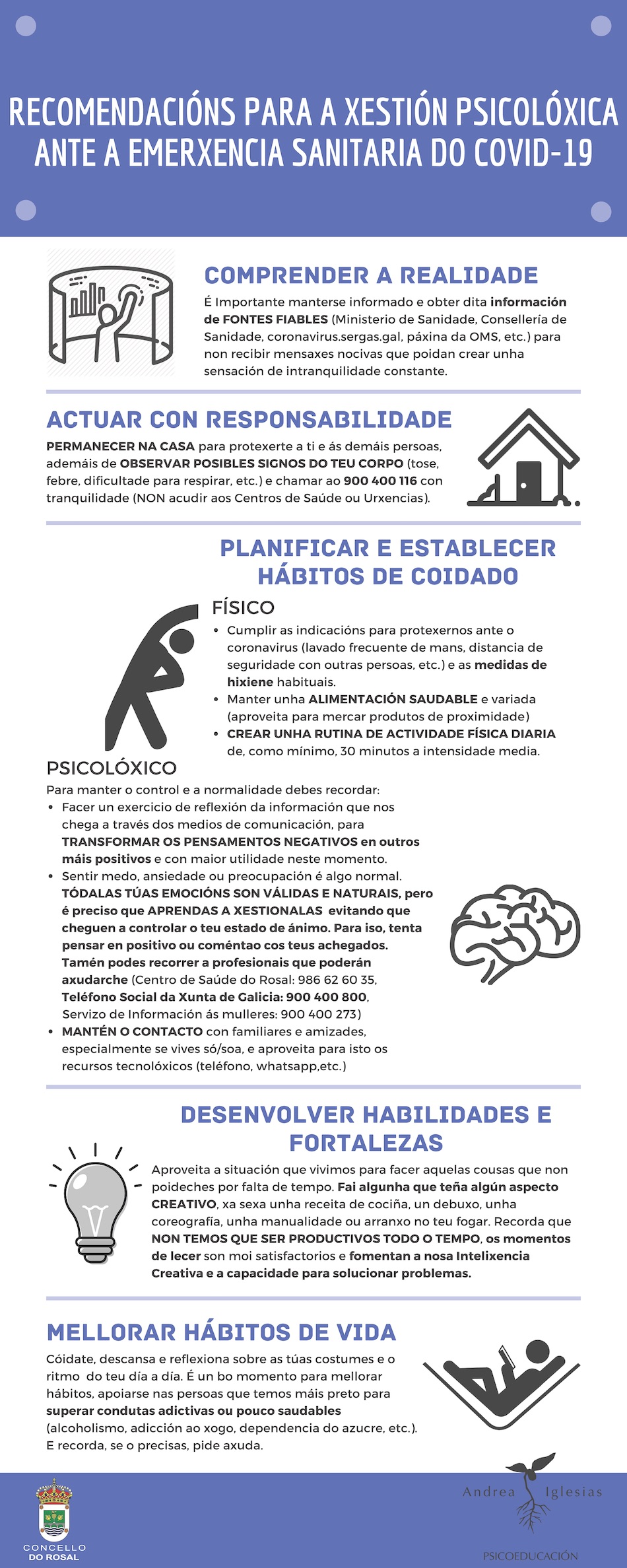 Un confinamiento forzoso del que toda la sociedad es consciente pero que acarrea efectos emocionales. Para minimizar esos efectos psicológicos negativos que puedan surgir del #EuQuedoNaCasa y del momento de crisis sanitaria que se está viviendo, la psicóloga Andrea Iglesias colaboró con el Concello de O Rosal en la elaboración de una serie de recomendaciones para la gestión psicológica ante la emergencia sanitaria del COVID-19, cinco consejos generales que puede aplicar todo el vecindario en estos tiempos.