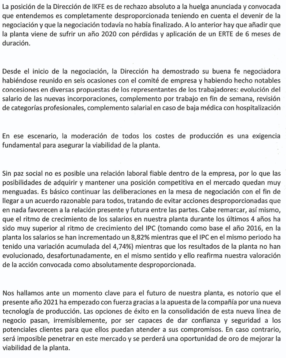 Por otro lado, desde la Dirección de IKF aseguran que en el día de hoy han presentado una nueva propuesta para retomar las negociaciones este miércoles que ha vuelto a ser rechazada por el comité de huelga. «Por lo tanto, las negociaciones continúan rotas, lamentablemente», señalan.