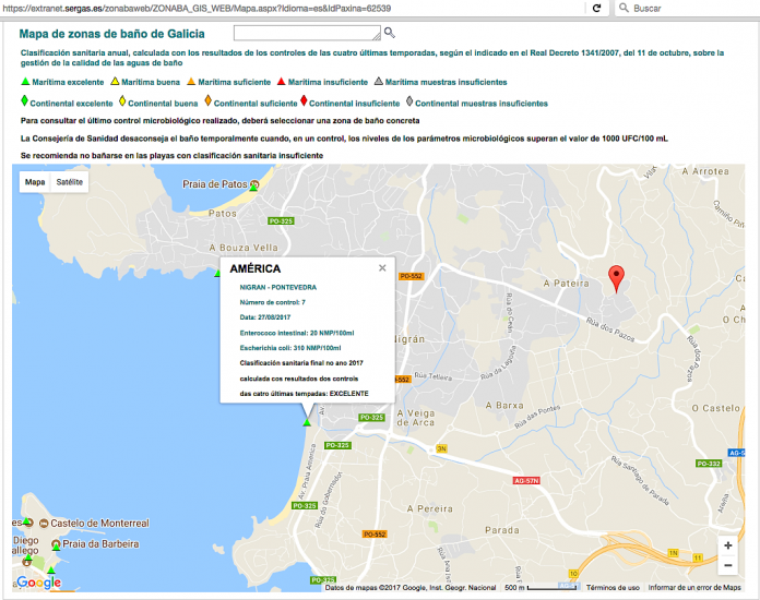 Los últimos controles microbiológicos en las zonas de baño de Galicia (realizados desde la Xunta los días 15 y 27 de agosto) son públicos y confirman que la calidad del agua en Playa América cumple con todos los parámetros para que sea considerada excelente y, por lo tanto, es apta para el baño (Controles Xunta).