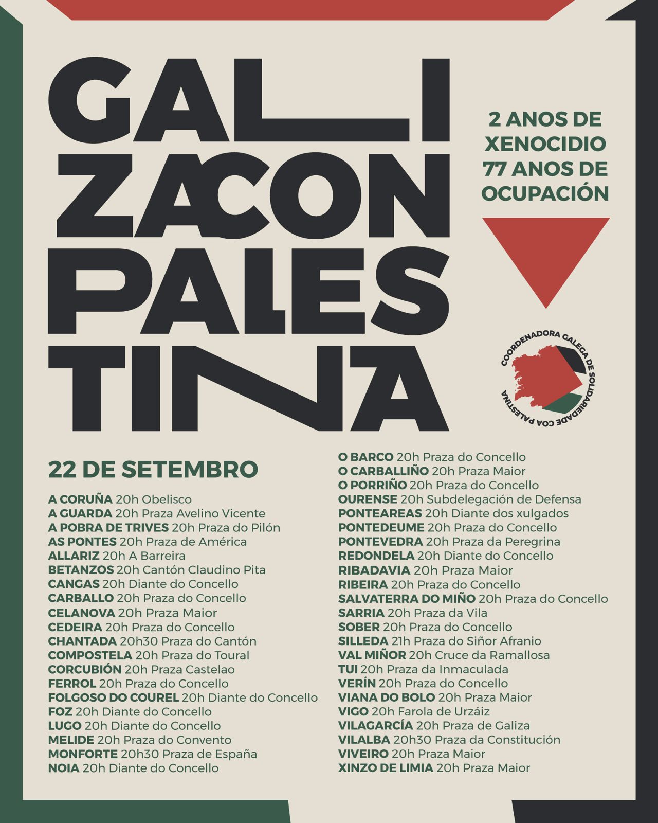 Las movilizaciones tendrán lugar en diferentes puntos de Galicia. En nuestro radio de acción será en Tui, A Guarda, Vigo, A Ramallosa y O Porriño, con el objetivo de visibilizar la situación en Palestina y reclamar el fin de la violencia y del genocidio que Israel está llevando a cabo contra la población civil.