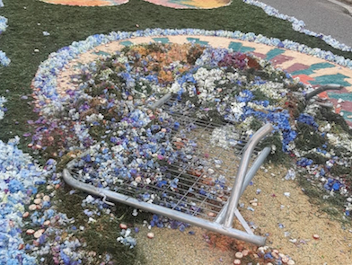 Indignación en Gondomar tras el destrozo de varias alfombras florales en la calle Eduardo Iglesias. Los vándalos utilizaron un coche y tan sólo necesitaron un minuto para deshacer todo el trabajo de las decenas de personas que estuvieron toda la tarde noche elaborando esta arte centenaria.