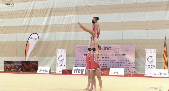 Este fin de semana se ha celebrado en el polideportivo Cabanyal de Valencia, el Campeonato de España de Gimnasia Acrobática base y absoluto, donde el Acro Club Nigrán ha desplazado a dieciocho gimnastas, el triple que en último nacional pre-pandemia.