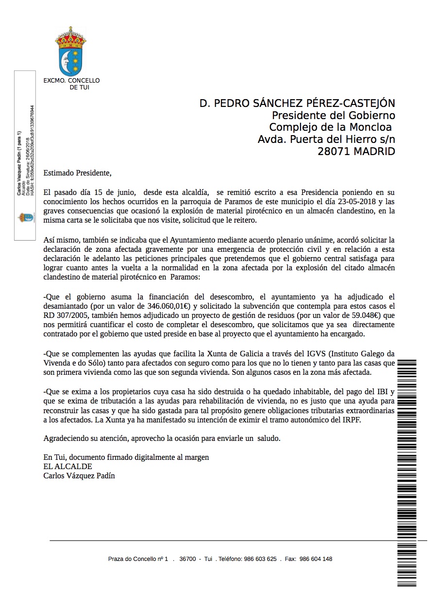 El alcalde de Tui, Carlos Vázquez Padín, viene de concretar al presiden del gobierno, Pedro Sánchez, las peticiones del Concello de Tui para la atención a la zona afectada por la explosión de material pirotécnico en un almacén clandestino registrada el pasado 23 de mayo.
