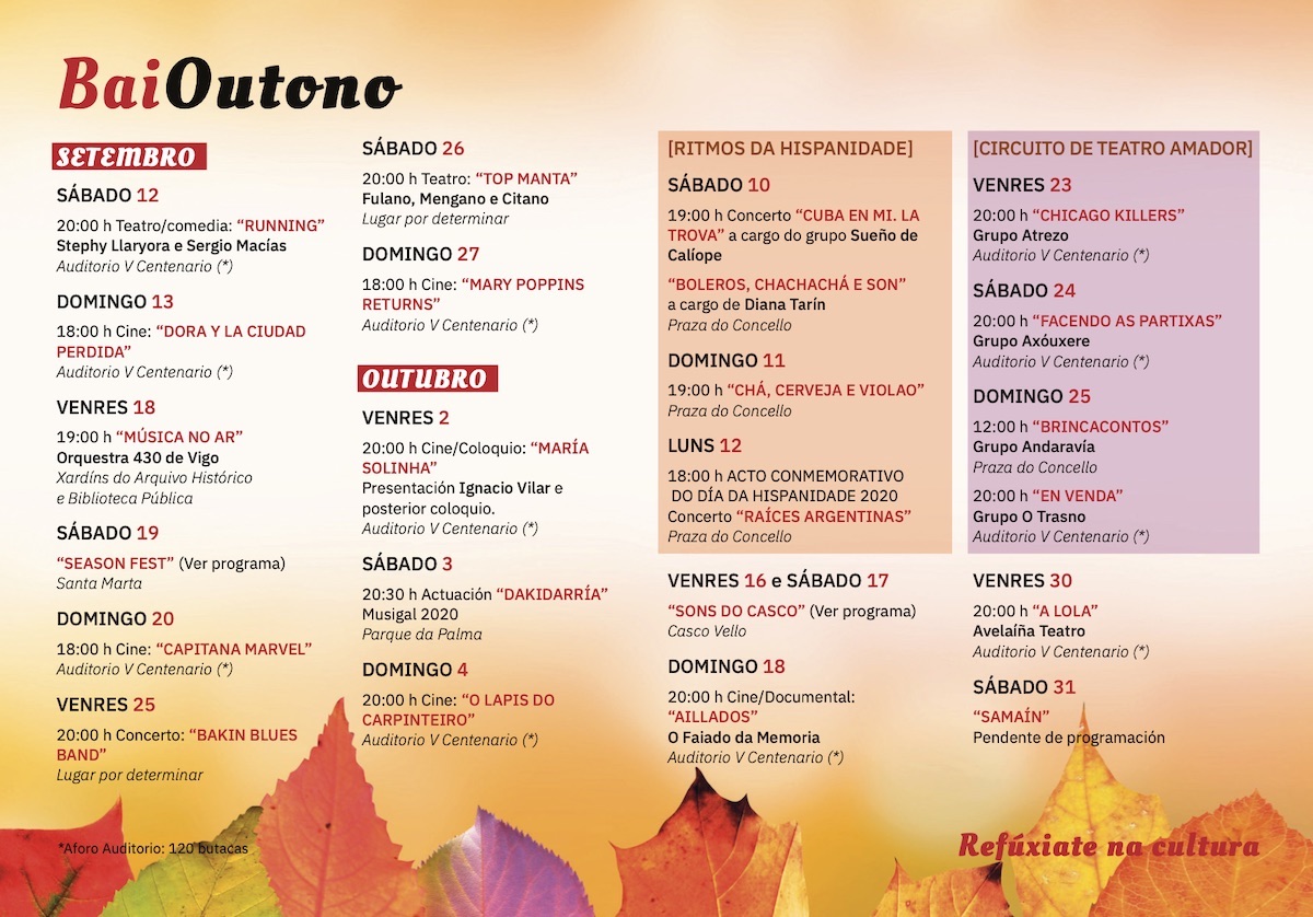 La Concejalía de Cultura del Concello de Baiona, ha preparado la agenda cultural para este otoño con el programa BaiOutono, que llega cargado de entretenimiento para vecinos y turista con teatro, cine, conciertos, el Samaín, Son do Casco, Season Fest o el Día de la Hispanidad.