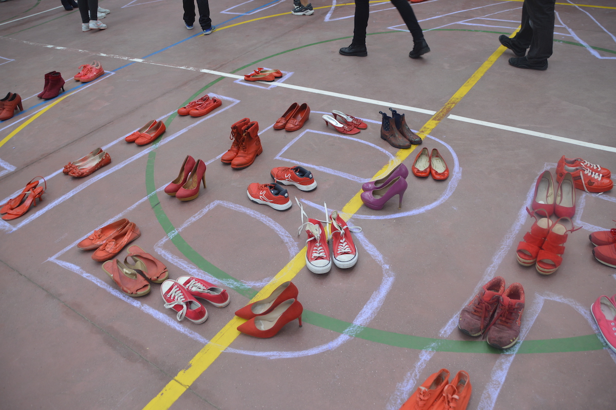 Todo el alumnado del centro les rindió homenaje leyendo, uno por uno, los datos de las mujeres asesinadas; mientras colocaron un par de zapatos rojos en recuerdo de cada una, como hiciera la artista mexicana Elina Chauvet.