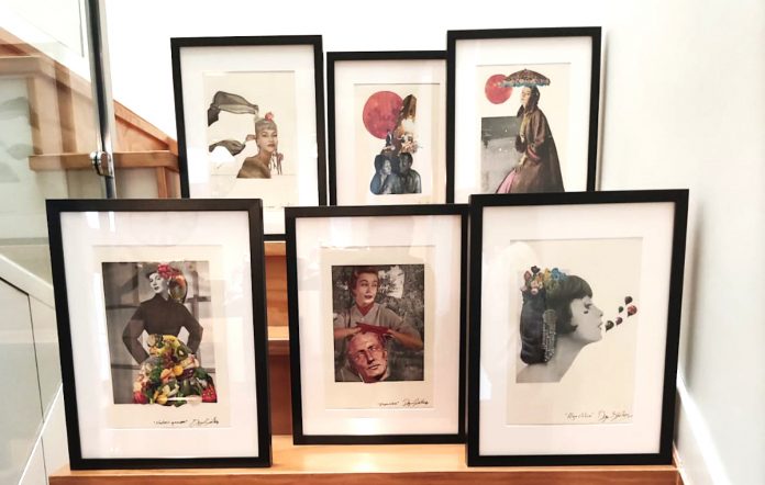 Es la primera vez que Giráldez expone sus collages, una técnica que practica desde la juventud, «cando estudaba Historia da Arte en Compostela«, y que retomó hace un par de años, «con menos sentido do ridículo e máis actitude«, indica. La muestra, que arranca con un texto que la escritora Emma Pedreira le dedica a los collages del autor porriñés, se componen de 13 obras en las que predominan la figura femenina, “mui cinematográfica”, e incluso un homenaje al cine de catástrofes de los años 70 (Terremoto, Aeropuerto, El coloso en llamas,…).