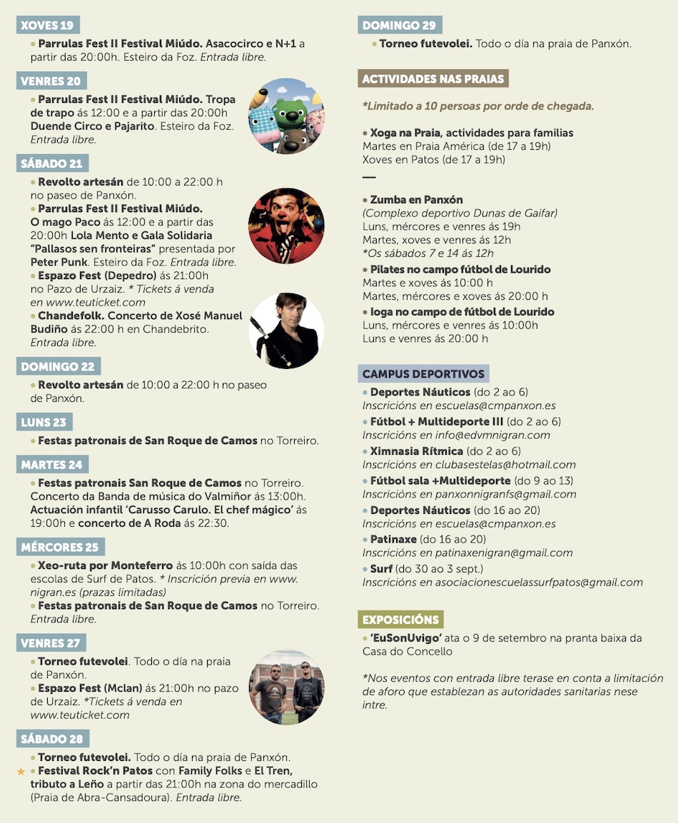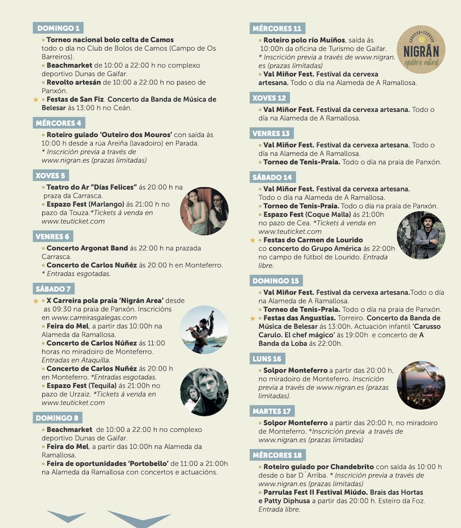 El Concello de Nigrán continúa este verano con su lema ‘Nigrán, equilibrio natural’ para presentar una programación sociocultural de agosto en el que se mantienen los principales eventos de cada año y se añaden novedades para todo tipo de públicos y gustos.
