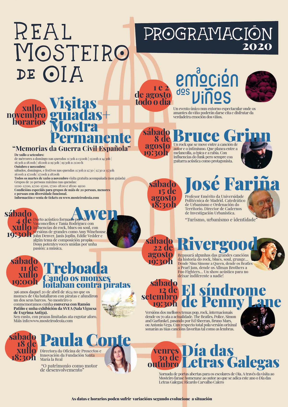 Durante estos últimos meses, se trabajó en la definición del programa cultural del 2020 con la idea de lanzar una oferta única y diversa, en la que se mantendrían eventos conocidos como la efeméride de los ataques piratas sufridos por el cenobio, el día de las letras galegas, conversas con reconocidos expertos del ámbito académico/cultural o los ya tradicionales solpores en los que volver a disfrutar de música en directo mientras el sol se pone en el atlántico… pero además se suman nuevos eventos alrededor de la música y del conocimiento del vino.