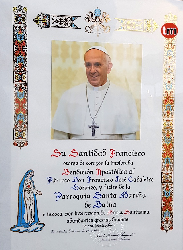 Su Santidad el Papa Francisco, otorgó de Corazón la Implorada Bendición Apostólica al párroco Don Francisco José Cabaleiro Lorenzo y a los fieles de la parroquia de Santa Mariña de Baíña, Baiona.