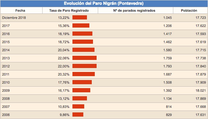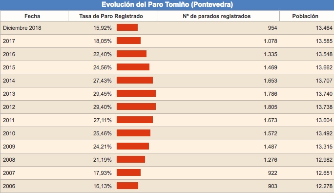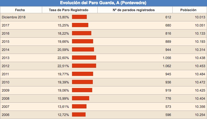 En los siguientes gráficos se puede ver la evolución del paro desde el 2006 hasta diciembre de 2018. Así, y según los datos facilitados por el Instituto Galego de Estadística, el paro se sitúa en el 16,61 % en Tui, en el 15,96 % en Gondomar, en el 15,95 % en Tomiño, en Baiona está en el 15,02 %, mientras que en Nigrán los datos del paro se sitúan en el 13,22 %, en Oia en el 16,12 %, en O Rosal en el 16,40% y en A Guarda en el 13,80%.