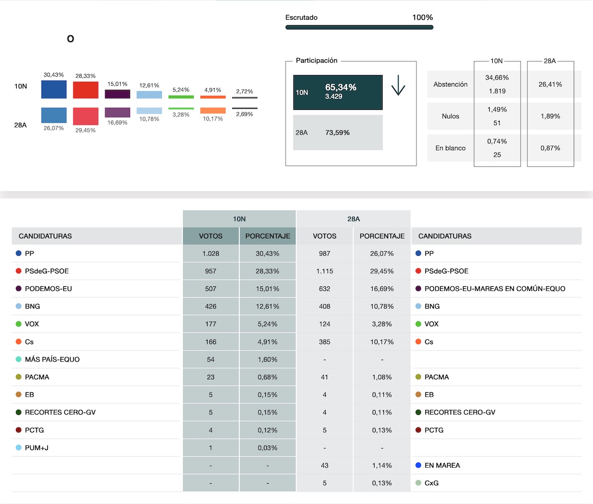 Escrutado el 100 % de los en votos en O Rosal, el Partido Popular logra la victoria con un 30,43 % y 1.028 votos, 41 más que en las anteriores elecciones generales del pasado mes de abril.