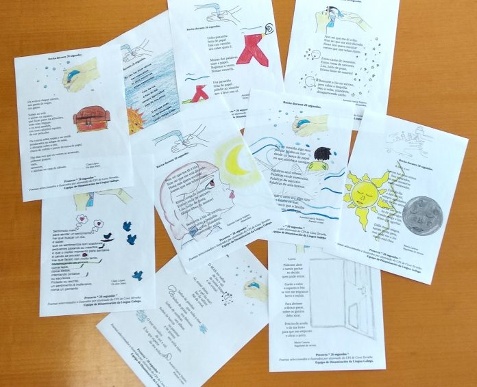 Atendiendo a esa medida sanitaria, el alumnado del centro seleccionó poemas en lengua gallega que pueden ser recitados en ese período de tiempo. Con ellos elaboraron carteles con ilustraciones para colocar en los sitios donde se higienizan las manos.
