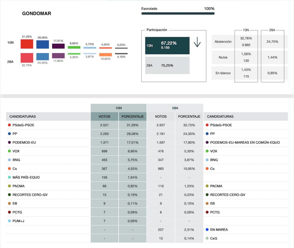 Escrutado el 100 % de los en votos en Gondomar, el PSOE logra la victoria con un 31,29 % y 2.521 votos, 416 menos que en las anteriores elecciones generales del pasado mes de abril.