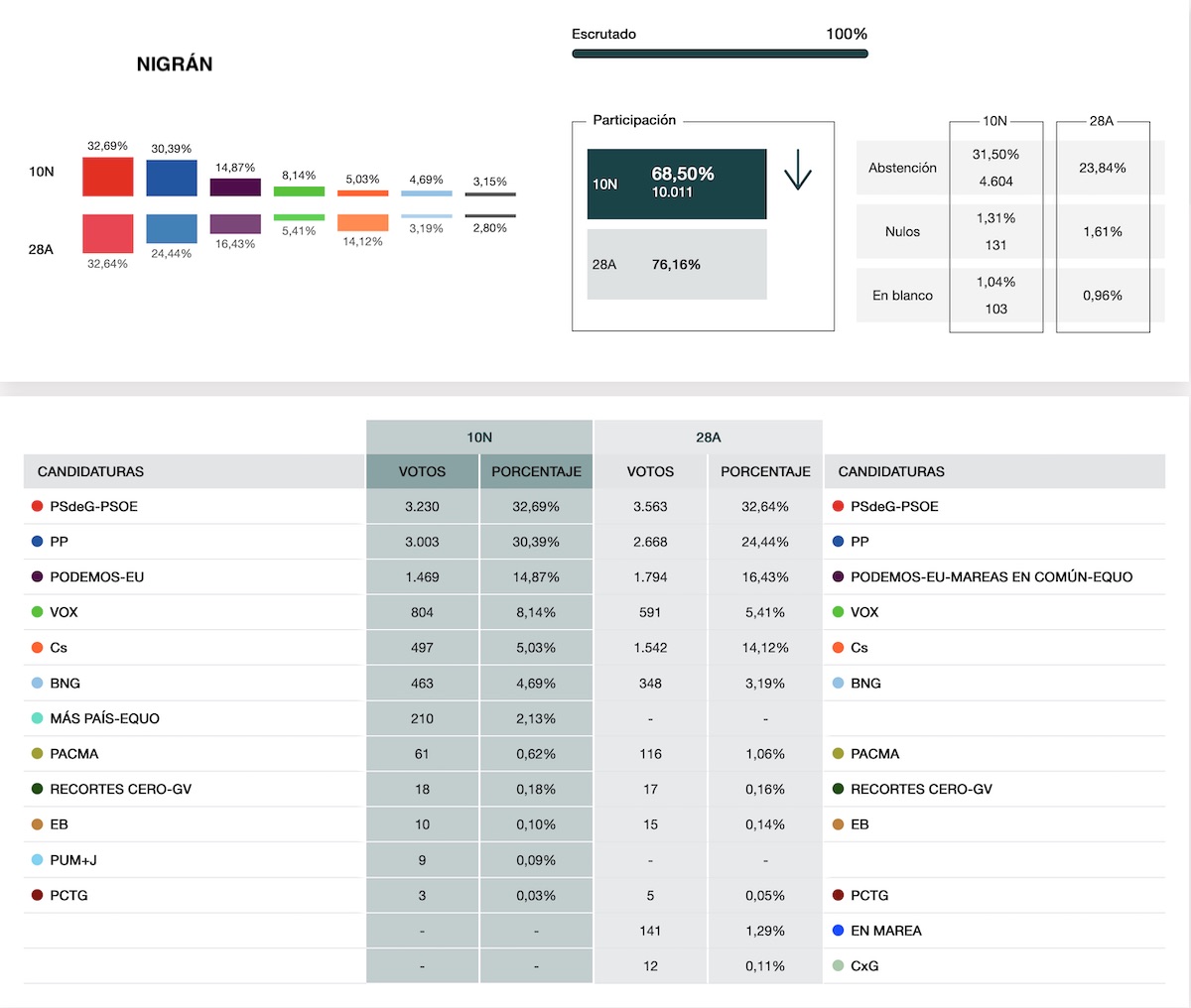 Escrutado el 100 % de los en votos en Nigrán, el PSOE logra la victoria con un 32,69 % y 3.230 votos, 333 menos que en las anteriores elecciones generales del pasado mes de abril.