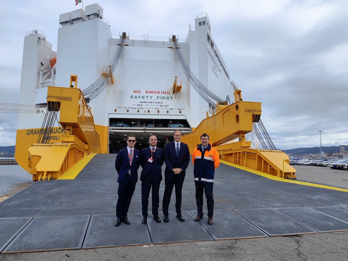 El acto de presentación, celebrado esta mañana en la Terminal Ro-Ro de Bouzas, ha contado con la presencia del capitán del buque, Giuseppe Ferranti; Sebastiano Cirnigliaro, Commercial Manager Automotive Division Spain de Grimaldi Logística España; Carlos Botana, presidente de la Autoridad Portuaria de Vigo, así como representantes del Grupo Grimaldi, de la Comunidad Portuaria, clientes y operadores del sector logístico.