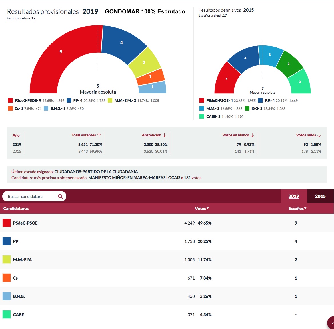 Le sigue en el recuento electoral de este largo domingo, el Partido Popular, que logra 1.733 votos y cuatro escaños, M.M.-E.M con 1.005 votos y dos concejales. CS y BNG logran ambos un representante en el concello de Gondomar.