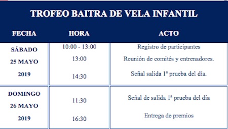 El sábado las pruebas darán comienzo a las dos y media de la tarde, una vez finalice la recepción de regatistas en Baiona y la reunión de entrenadores y comités. La primera señal de salida del domingo se dará algo más temprano, a las once y media, con el objetivo de que las regatas puedan estar finalizadas antes de las cuatro y media, hora en la que está prevista la celebración de la entrega de premios. Se entregarán trofeos a los tres primeros clasificados de cada categoría y el ganador de cada una de ellas se llevará, además, un cheque para compra de material náutico.