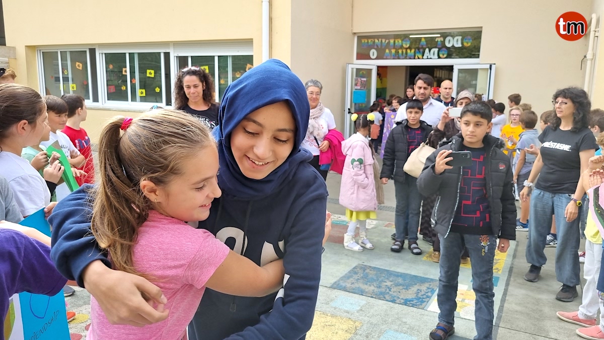 Antes de partir a Sobrado dos Monxes, la familia afgana, fue recibida esta mañana en el Humberto Juanes en un emotivo acto solidario con presencia de todo el alumnado y profesorado, además del alcalde de Nigrán, Juan González. “Al principio de curso creamos un sistema solar para establecer una actividad con el mundo de las estrellas y Afganistán y le pusimos el nombre de Elnaz al conocer su historia y de que venía aquí”, señaló Marina Vidal, profesora del centro.