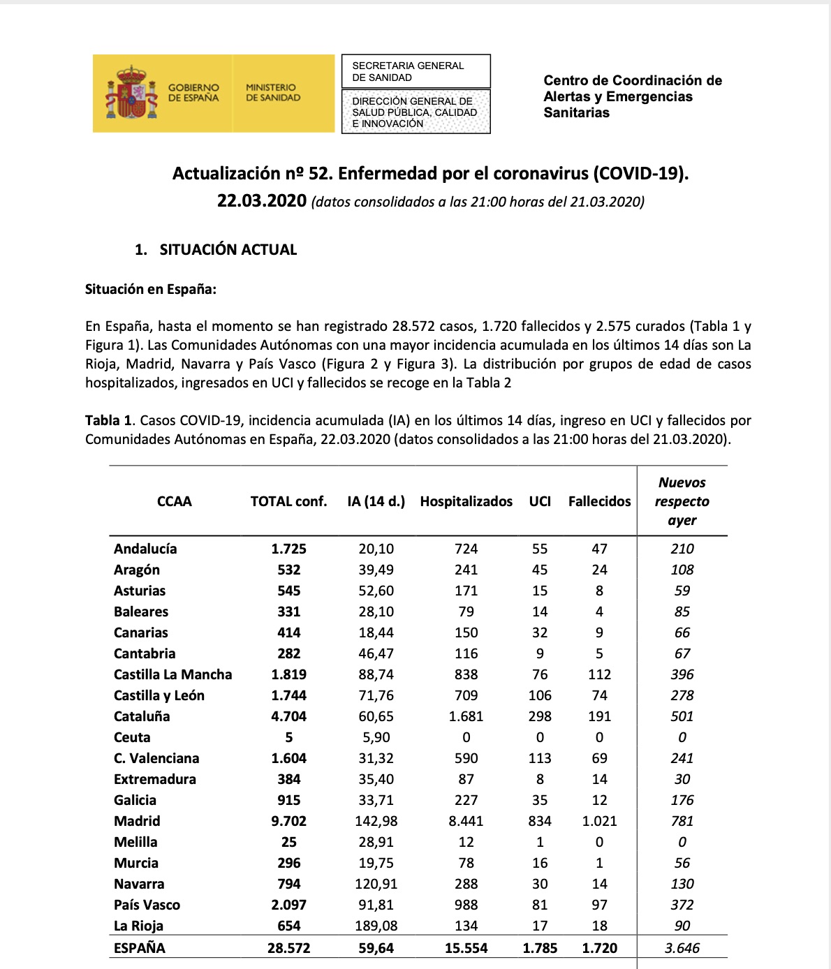 Las cifras no paran de crecer. Según el último balance del Ministerio de Sanidad, España ha alcanzado ya los 28.572 casos confirmados y los 1.720 fallecidos, 3.646 casos más que este sábado. La buena noticia es que se han dado de alta 2.575 personas.