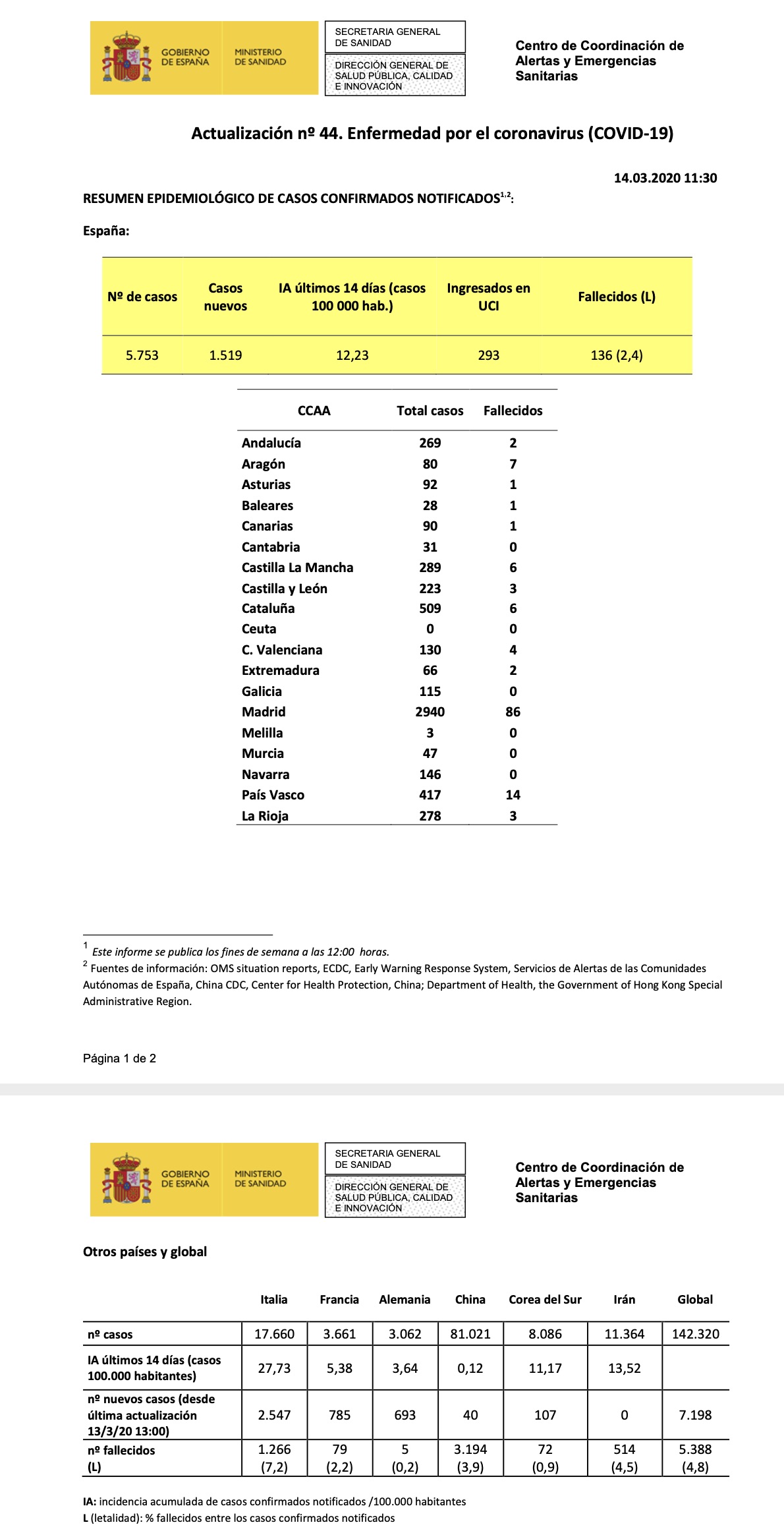El Ministerio de Sanidad ha actualizado los datos de los casos confirmados en España por Coronavirus que superan ya las 5.750 personas infectadas, 1.519 más que ayer. Los fallecidos ascienden a 136 en todo el país.