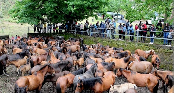 Ya por la tarde comienza el ritual de A Rapa das Bestas. Los ganaderos separan, marcan a fuego y cortan las crines de las reses. Los potros, además de marcarlos con el símbolo de la ganadería de sus dueños, se les implanta el microchip. Luego, las bestas son devueltas a los montes de A Groba donde viven todo el año en libertad.