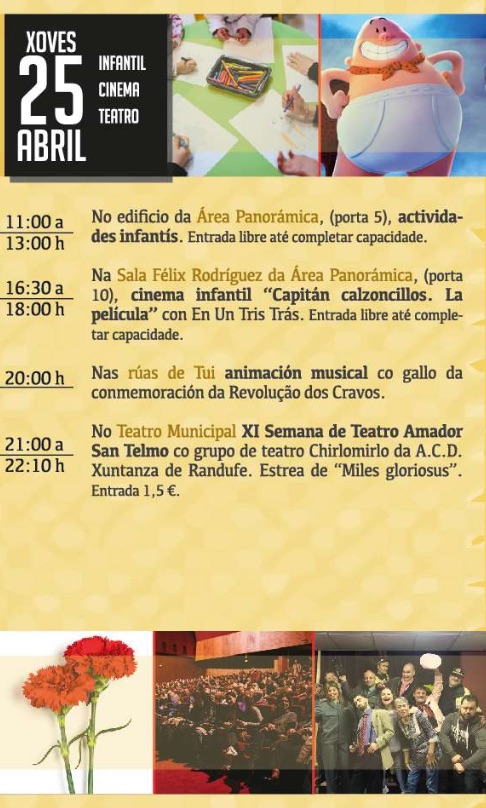 Dentro da XI Semana de Teatro Amador, ás 21:00 horas, será a quenda do grupo de teatro Chirlomirlo no Teatro Municipal de Tui que estreará “Miles gloriosus”. As entradas, sen numerar, poranse á venda ás 20.30 horas ao prezo de 1,5€.
