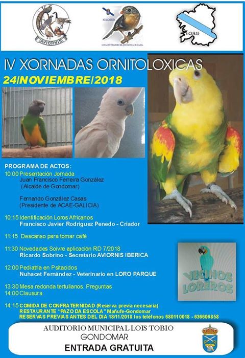 El evento, al que acudirá el alcalde de Gondomar, Francisco Ferreira, será presidido por Fernando González Casas (Presidente de ACAE-GALICIA), encargado de introducir a los diferentes expertos sobre ornitología: Francisco Javier Rodríguez Penedo (criador), con un relatorio sobre la identificación de los loros africanos, Ricardo Sobrino Vicente (Secretario AVIORNIS IBÉRICA), que traerá todas las novedades sobre Soivre y Nuhacet Fernández (veterinario de LORO PARQUE, Tenerife) que hablará sobre la pediatría en Psitacidos.