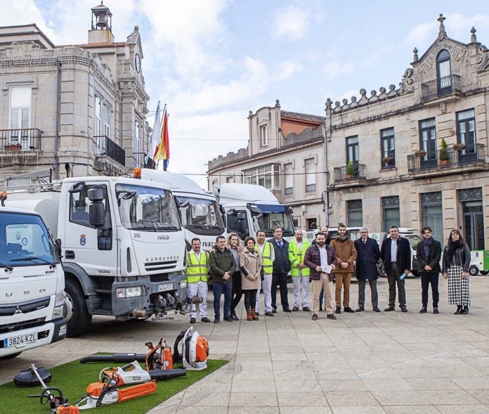 El alcalde de Gondomar, Paco Ferreira, acompañado por el edil de Medioambiente e Transición Ecolóxica, Brais Misa, presentaron hoy la nueva flota de camiones y maquinaria del servicio de recogida de basura y limpieza del municipio.