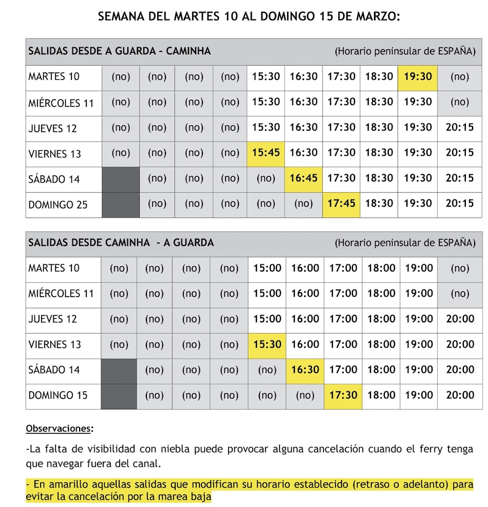 Esta semana las salidas del ferry se verán afectadas por la marea baja. Por lo tanto, se adjunta la tabla con los horarios definitivos hasta el domingo 15 de marzo con las salidas confirmadas y aquellas que sufren alguna variación están marcadas.