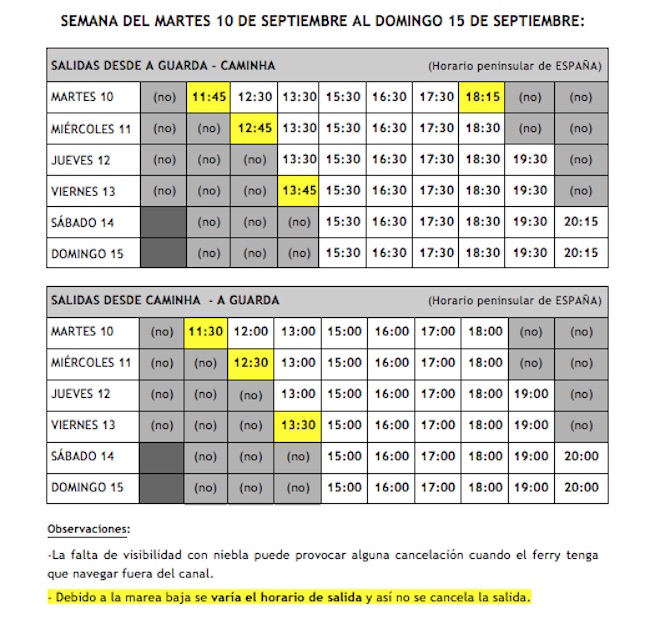 Esta semana las salidas del ferry se verán afectadas por la marea baja. Por lo tanto, se adjunta la tabla con los horarios definitivos hasta el domingo 15 de septiembre con las salidas confirmadas y aquellas que sufren alguna variación están marcadas.
