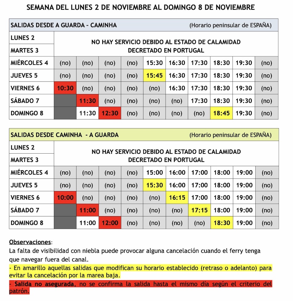 Esta semana las salidas del ferry se verán afectadas por la marea baja. Por lo tanto, se adjunta la tabla con los horarios confirmados hasta el domingo 8 de noviembre con las salidas confirmadas y aquellas que sufren alguna variación están marcadas.