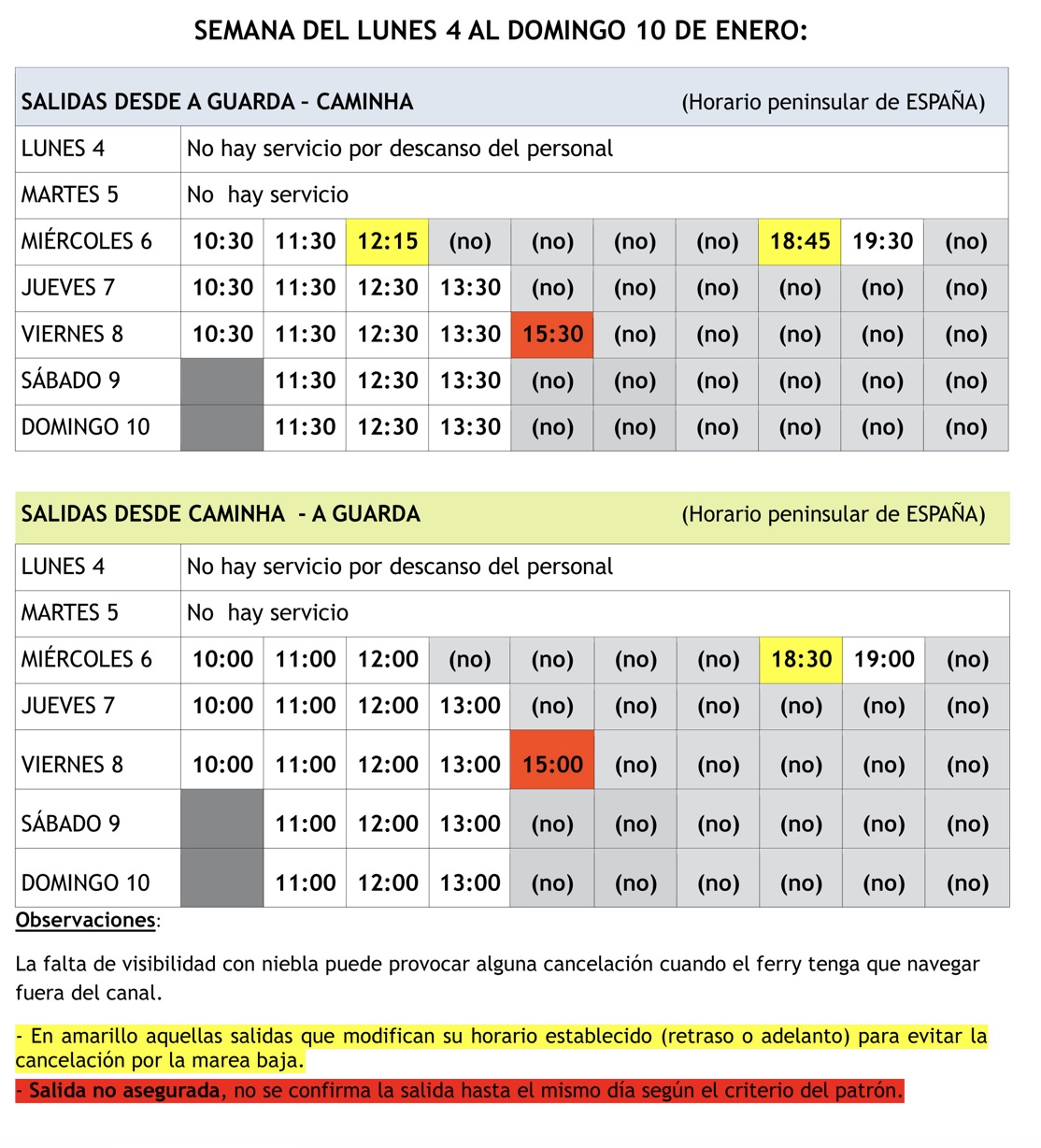 Esta semana las salidas del ferry se verán afectadas por la marea baja. Por lo tanto, se adjunta la tabla con los horarios confirmados hasta el domingo 10 de enero con las salidas confirmadas y aquellas que sufren alguna variación están marcadas.